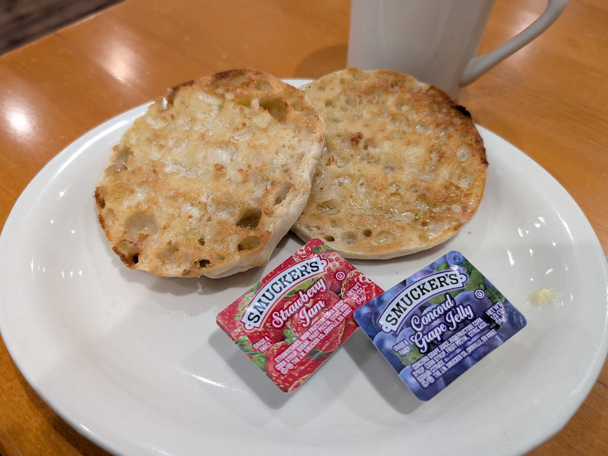 Made with 2 slices of french toast or 2 pancakes, 2 eggs (any style), 2 pieces of bacon or taylor ham or one sausage link or patty. Served with regular coffee or tea (dine-in only!).